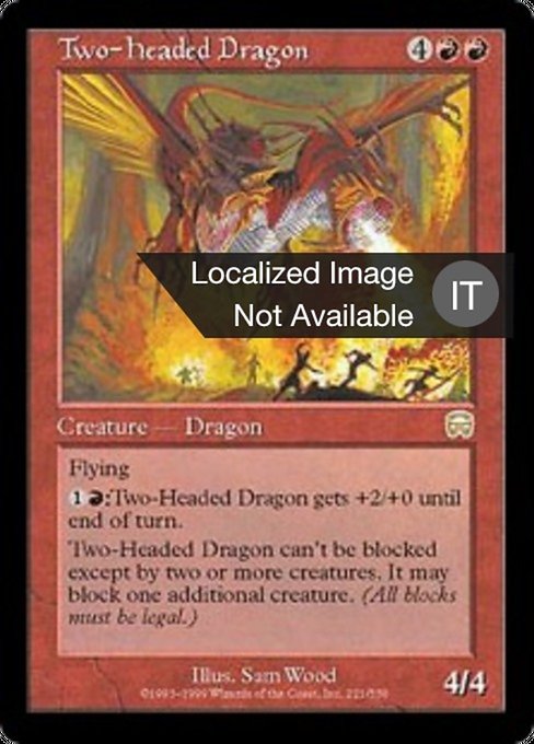 ![]() Variations— Parts— | Drago a Due Teste4 / 4 Volare (Questa creatura non può essere bloccata tranne che da creature con volare.) Il Drago a Due Teste non può essere bloccato tranne che da due o più creature. Il Drago a Due Teste può bloccare una creatura addizionale.