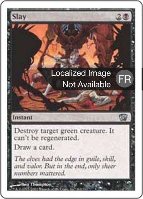 ![]() Variations— Parts— | SlayDestroy target green creature. It can't be regenerated. Draw a card.