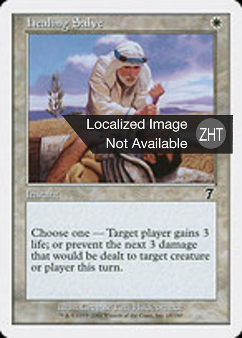 ![]() Variations— Parts— | Healing SalveChoose one — • Target player gains 3 life. • Prevent the next 3 damage that would be dealt to any target this turn.