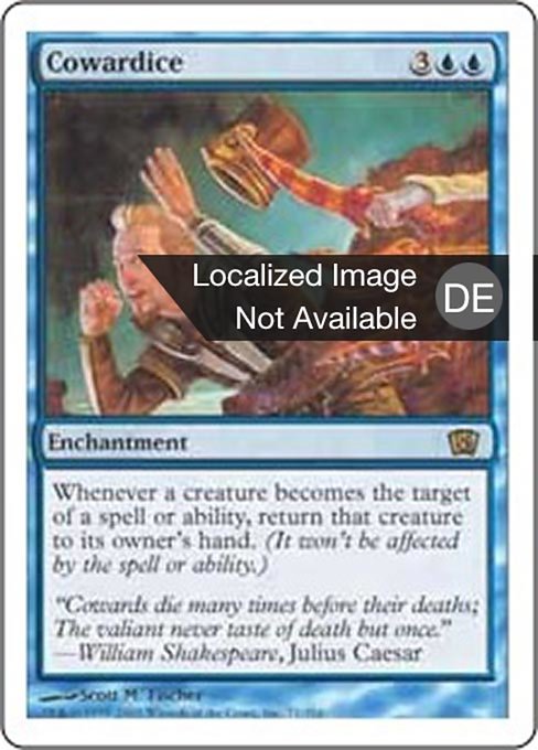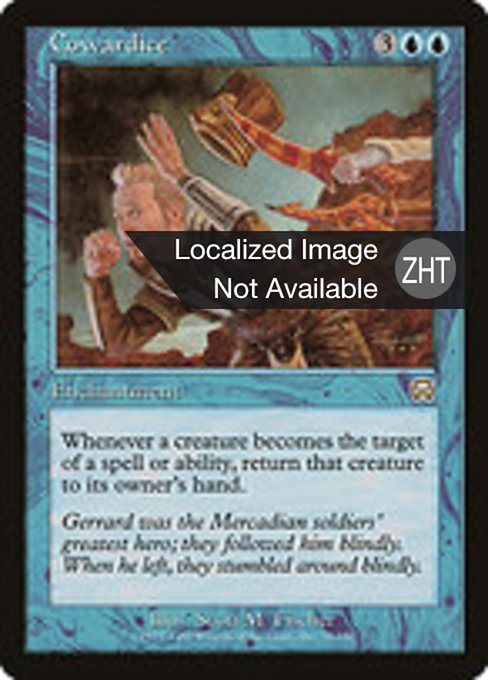 ![]() Variations— Parts— | CowardiceWhenever a creature becomes the target of a spell or ability, return that creature to its owner's hand. (It won't be affected by the spell or ability.)