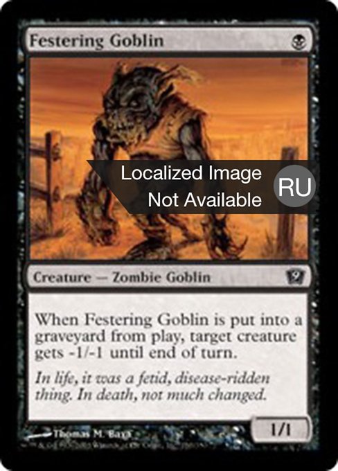 ![]() Variations : 1Parts— | Festering Goblin1 / 1 When this creature dies, target creature gets -1/-1 until end of turn.