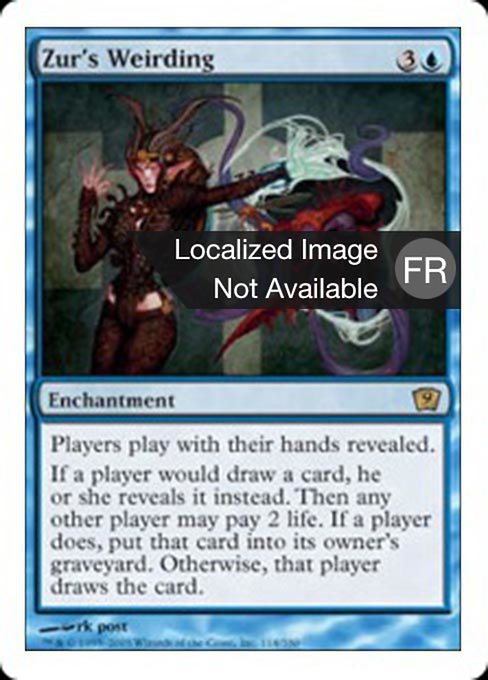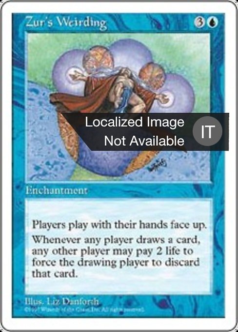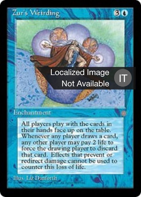 ![]() Variations— Parts— | Malia di ZurI giocatori giocano a carte scoperte. Se un giocatore sta per pescare una carta, invece la rivela. Poi ogni altro giocatore può pagare 2 punti vita. Se un giocatore paga, metti quella carta nel cimitero del suo proprietario. Altrimenti, quel giocatore pesca la carta.