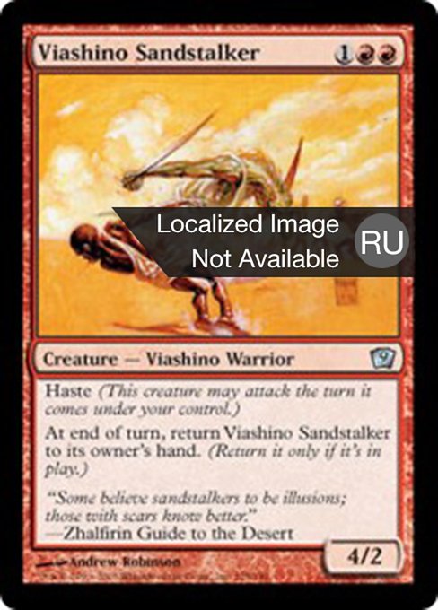 ![]() Variations— Parts— | Cacciatore delle Sabbie Viashino4 / 2 Rapidità (Questa creatura può attaccare nel turno in cui entra sotto il tuo controllo.) Alla fine del turno, il proprietario riprende in mano il Cacciatore delle Sabbie Viashino. (Soltanto se è in gioco.)