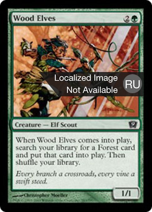 |  Variations— Parts— | Elfi dei Boschi1 / 1 Quando gli Elfi dei Boschi entrano in gioco, passa in rassegna il tuo grimorio, scegli una carta Foresta e metti in gioco quella carta. Poi rimescola il tuo grimorio.