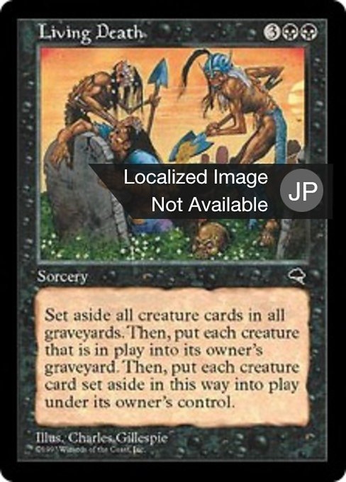 ![]() Variations— Parts— | 生ける屍各プレイヤーはそれぞれ、自分の墓地からクリーチャー・カードをすべて追放し、その後自分がコントロールしているクリーチャーをすべて生け贄に捧げ、その後これにより自分が追放したカードをすべて戦場に出す。