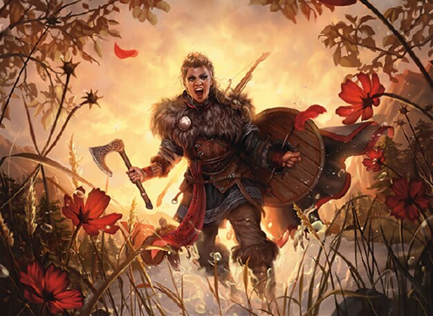 Immer wenn Eivor Wolfsmal einem Spieler Kampfschaden zufügt, millst du entsprechend viele Karten. Du kannst davon eine Sage-Karte und/oder eine Länderkarte ins Spiel bringen.