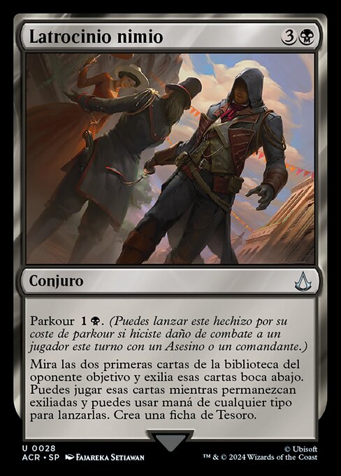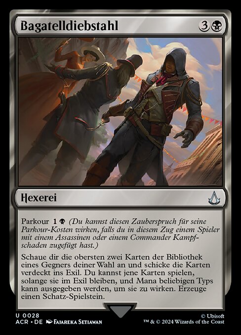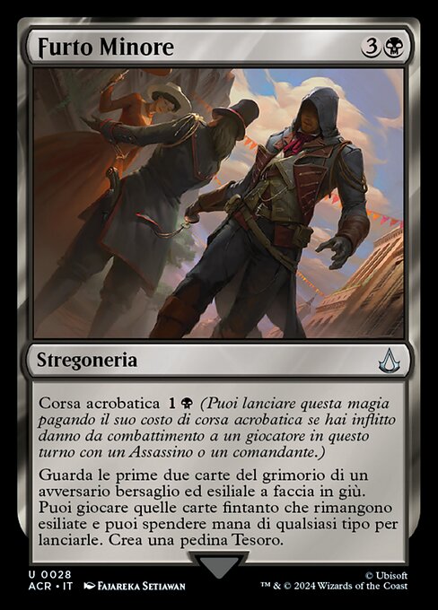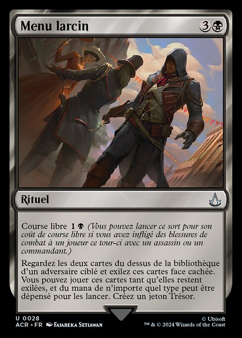 |  Variations : 1Parts : 2 | Petty LarcenyFreerunning  Look at the top two cards of target opponent's library and exile those cards face down. You may play those cards for as long as they remain exiled, and mana of any type can be spent to cast them. Create a Treasure token.