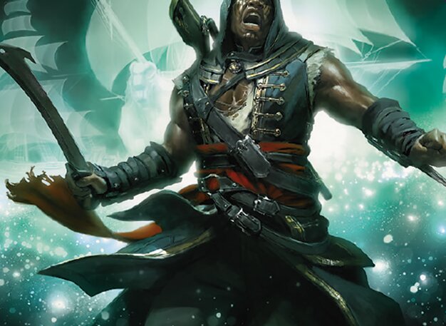 Quand Adéwalé arrive sur le champ de bataille, révélez les six cartes du dessus de votre bibliothèque. Mettez une carte d'assassin, de pirate ou de véhicule parmi elles dans votre main et le reste au-dessous de votre bibliothèque, dans un ordre aléatoire.