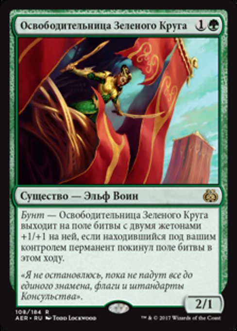 |  Variations— Parts— | Greenwheel Liberator2 / 1 Revolt — This creature enters with two +1/+1 counters on it if a permanent left the battlefield under your control this turn.