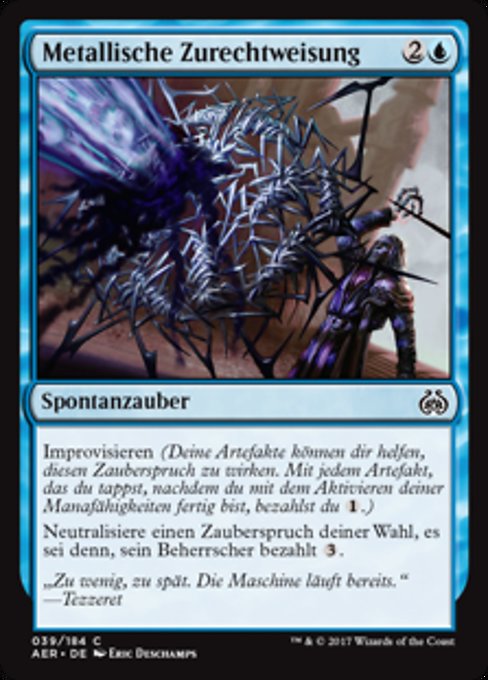 ![]() Variations— Parts— | Metallic RebukeImprovise (Your artifacts can help cast this spell. Each artifact you tap after you're done activating mana abilities pays for Counter target spell unless its controller pays