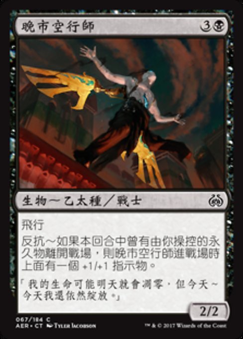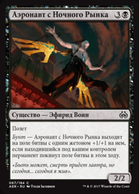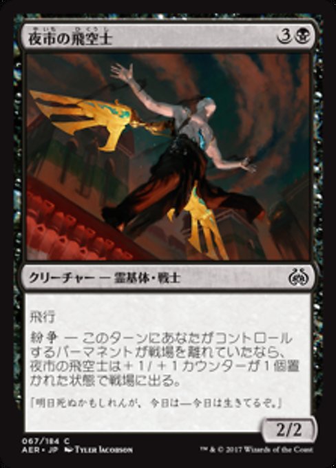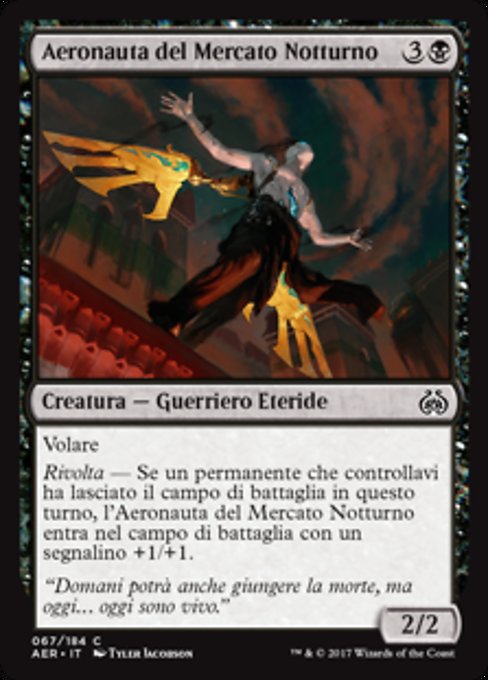![]() Variations— Parts— | Night Market Aeronaut2 / 2 Flying Revolt — This creature enters with a +1/+1 counter on it if a permanent left the battlefield under your control this turn.