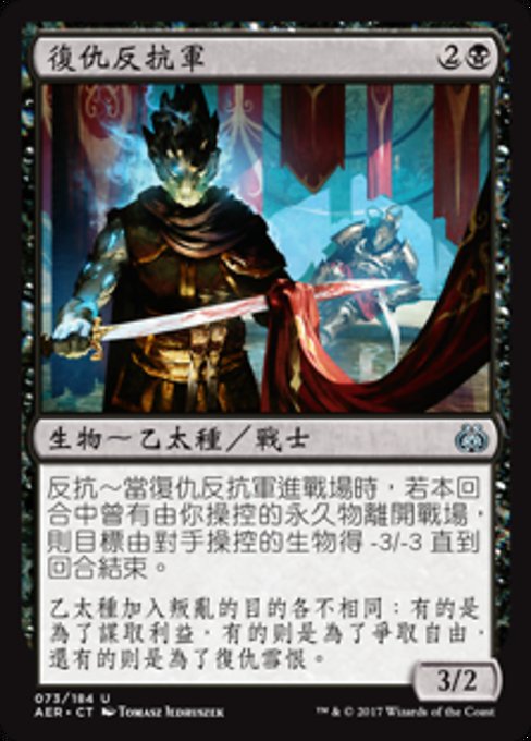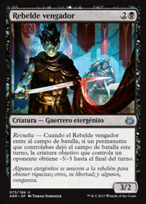 |  Variations— Parts— | Vengeful Rebel3 / 2 Revolt — When this creature enters, if a permanent left the battlefield under your control this turn, target creature an opponent controls gets -3/-3 until end of turn.