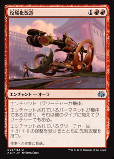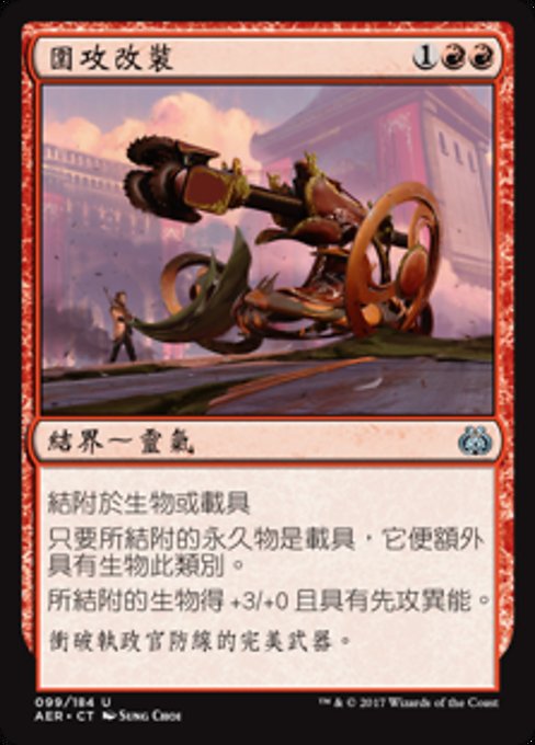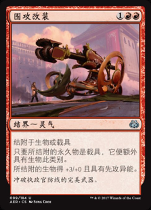 ![]() Variations— Parts— | Siege ModificationEnchant creature or Vehicle As long as enchanted permanent is a Vehicle, it's a creature in addition to its other types. Enchanted creature gets +3/+0 and has first strike.