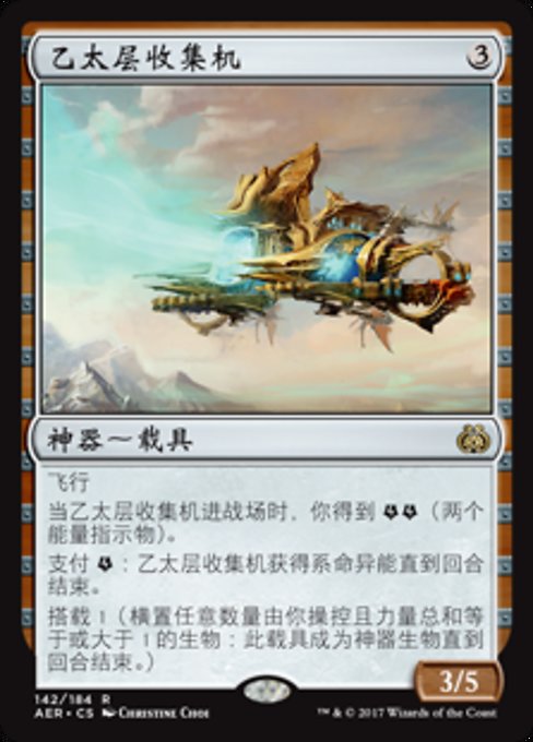 |  Variations— Parts— | Moissonneur de l'Éthersphère3 / 5 Vol Quand le Moissonneur de l'Éthersphère arrive sur le champ de bataille, vous gagnez Payez Pilotage 1 (Engagez n'importe quel nombre de créatures que vous contrôlez dont la force totale est supérieure ou égale à 1 : Ce véhicule devient une créature-artefact jusqu'à la fin du tour.)