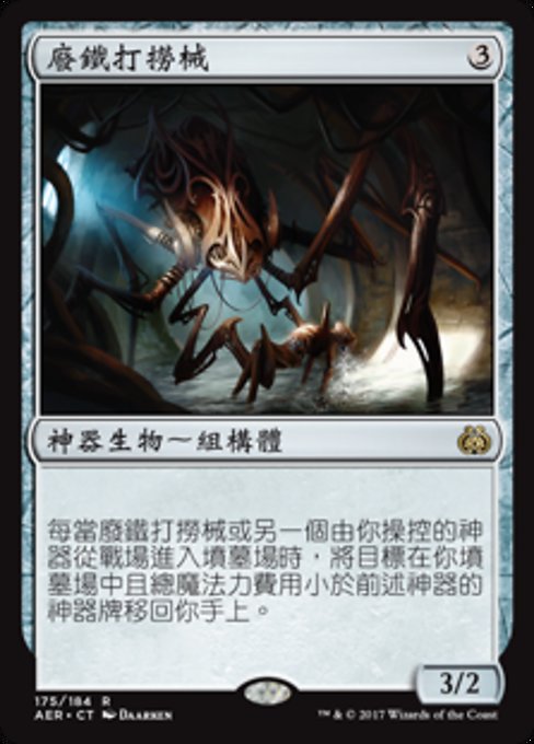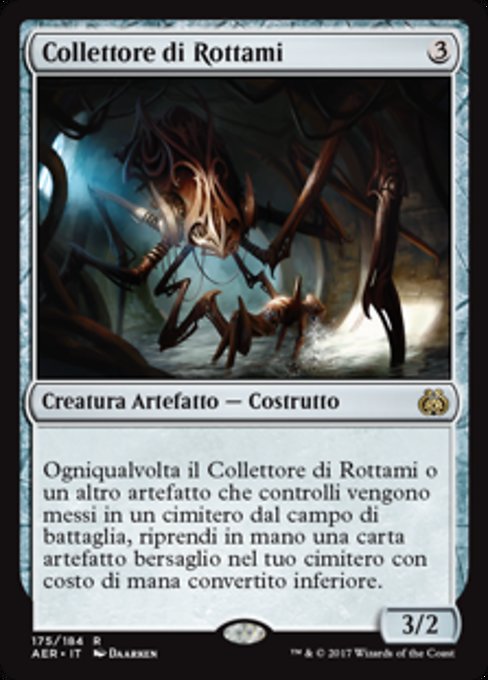 |  Variations— Parts— | Collettore di Rottami3 / 2 Ogniqualvolta il Collettore di Rottami o un altro artefatto che controlli vengono messi in un cimitero dal campo di battaglia, riprendi in mano una carta artefatto bersaglio nel tuo cimitero con costo di mana convertito inferiore.