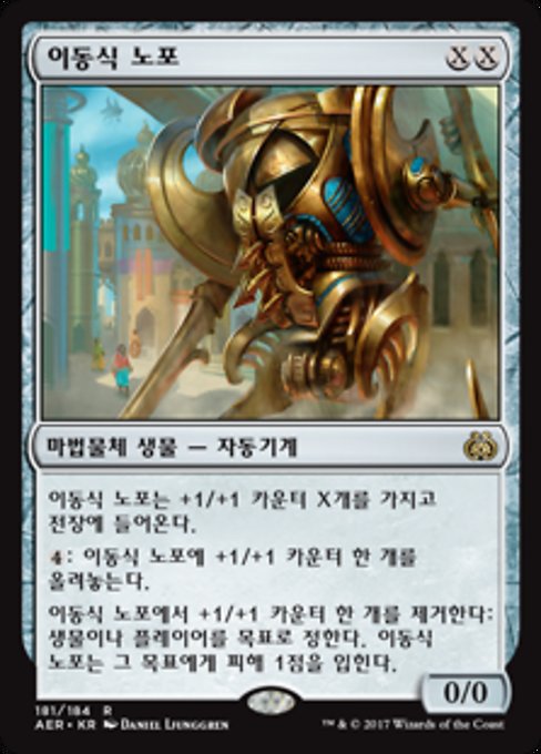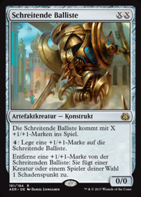 |  Variations— Parts— | Balista Mobile0 / 0 La Balista Mobile entra nel campo di battaglia con X segnalini +1/+1. Rimuovi un segnalino +1/+1 dalla Balista Mobile : Infligge 1 danno a una creatura o a un giocatore bersaglio.