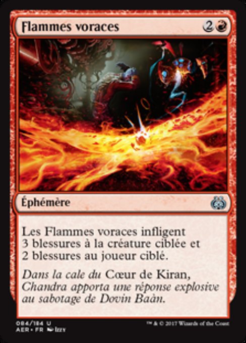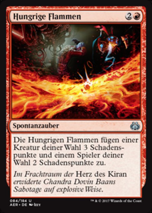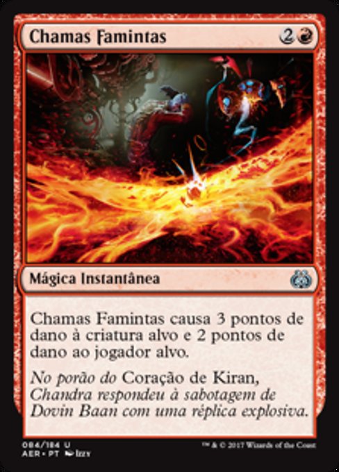![]() Variations— Parts— | Fiamme FamelicheLe Fiamme Fameliche infliggono 3 danni a una creatura bersaglio e 2 danni a un giocatore bersaglio.