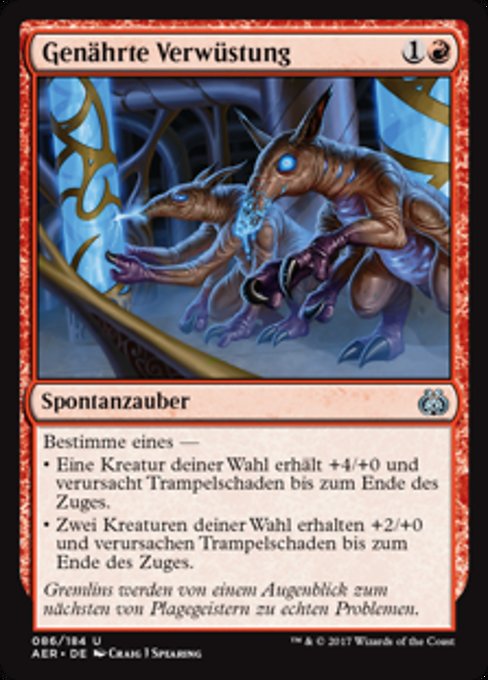 ![]() Variations— Parts— | Frenesia EnergeticaScegli uno — • Una creatura bersaglio prende +4/+0 e ha travolgere fino alla fine del turno. • Due creature bersaglio prendono +2/+0 e hanno travolgere fino alla fine del turno.