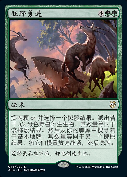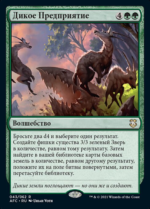 ![]() Variations : 1Parts : 2 | Wild EndeavorRoll two d4 and choose one result. Create a number of 3/3 green Beast creature tokens equal to that result. Then search your library for a number of basic land cards equal to the other result, put them onto the battlefield tapped, then shuffle.
