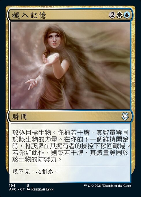 |  Variations— Parts— | Desvanecerse en la memoriaExilia la criatura objetivo. Tú robas una cantidad de cartas igual a la fuerza de esa criatura. Al comienzo de tu próximo mantenimiento, regresa esa carta al campo de batalla bajo el control de su propietario. Si lo haces, descarta una cantidad de cartas igual a la resistencia de esa criatura.
