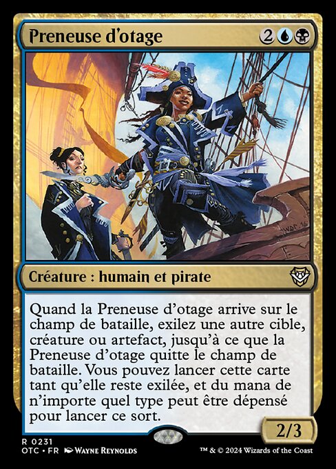 |  Variations— Parts— | Preneuse d'otage2 / 3 Quand la Preneuse d'otage arrive sur le champ de bataille, exilez une autre cible, créature ou artefact, jusqu'à ce que la Preneuse d'otage quitte le champ de bataille. Vous pouvez lancer cette carte tant qu'elle reste exilée, et vous pouvez dépenser du mana comme s'il s'agissait de mana de n'importe quel type pour lancer ce sort.