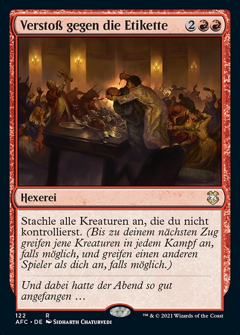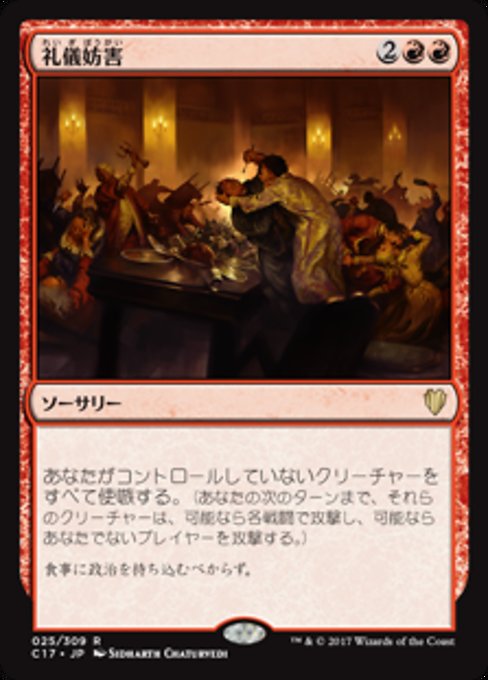 |  Variations— Parts— | 礼儀妨害あなたがコントロールしていないすべてのクリーチャーを使嗾する。(次のあなたのターンまで、それらのクリーチャーは、各戦闘で可能なら攻撃し、可能ならあなたでないプレイヤーを攻撃する。)