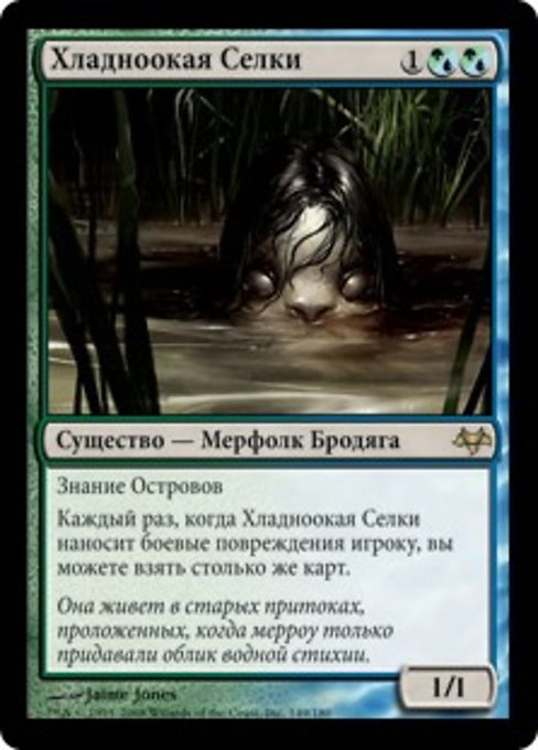 |  Variations— Parts— | Хладноокая Селки1 / 1 Знание Островов (Это существо не может быть заблокировано, пока защищающийся игрок контролирует Остров.) Каждый раз, когда Хладноокая Селки наносит боевые повреждения игроку, вы можете взять такое же количество карт.