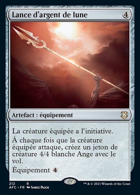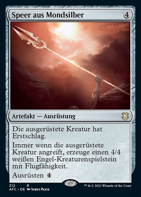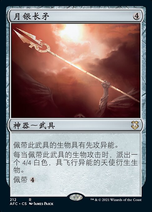 |  Variations— Parts— | 月銀長矛佩帶此武具的生物具有先攻異能。 每當佩帶此武具的生物攻擊時,派出一個4/4白色,具飛行異能的天使衍生生物。 佩帶