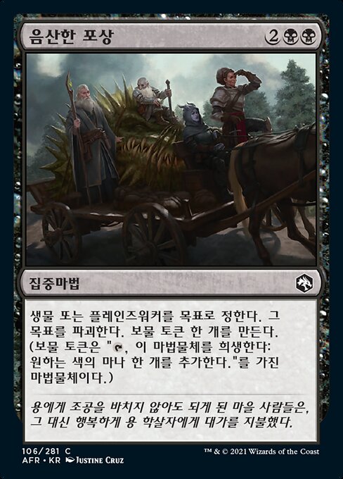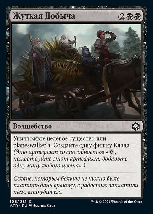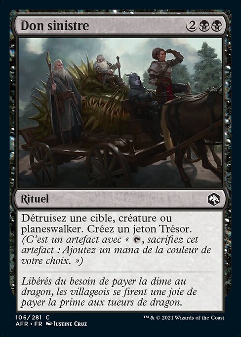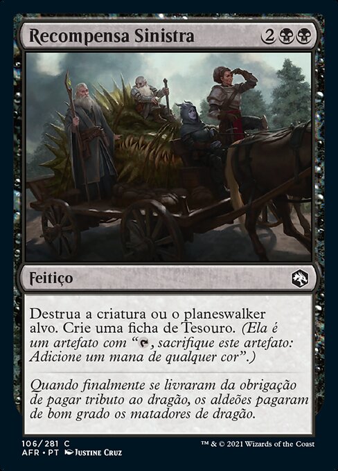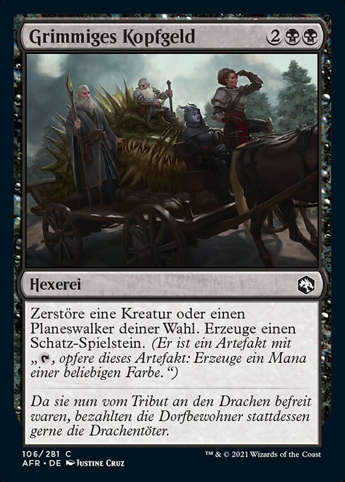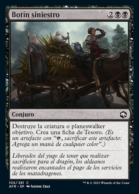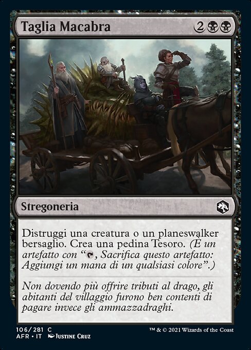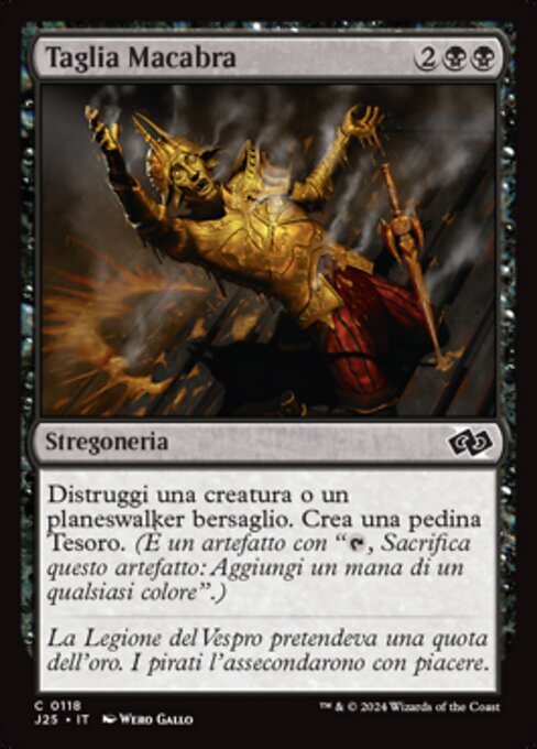 |  Variations— Parts— | Taglia MacabraDistruggi una creatura o un planeswalker bersaglio. Crea una pedina Tesoro. (È un artefatto con "