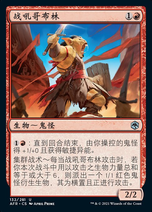 ![]() Variations— Parts— | Goblin del Grido di Guerra2 / 2 Tattiche del Branco — Ogniqualvolta il Goblin del Grido di Guerra attacca, se hai attaccato con creature con forza totale pari o superiore a 6 in questo combattimento, crea una pedina creatura Goblin 1/1 rossa TAPpata e attaccante.