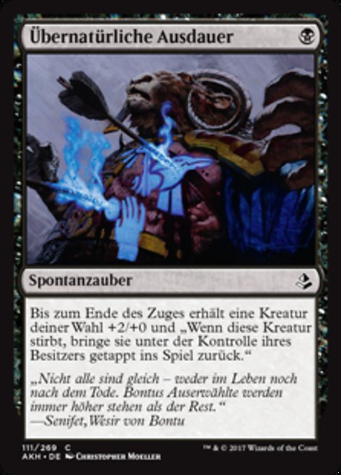 |  Variations— Parts— | Supernatural StaminaUntil end of turn, target creature gets +2/+0 and gains "When this creature dies, return it to the battlefield tapped under its owner's control."