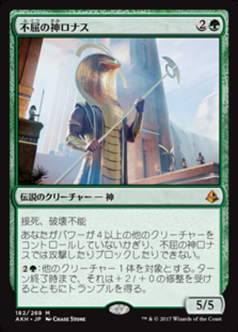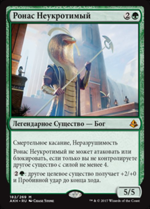 ![]() Variations— Parts— | Rhonas the Indomitable5 / 5 Deathtouch, indestructible Rhonas can't attack or block unless you control another creature with power 4 or greater.