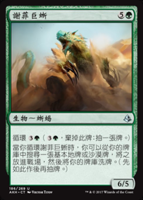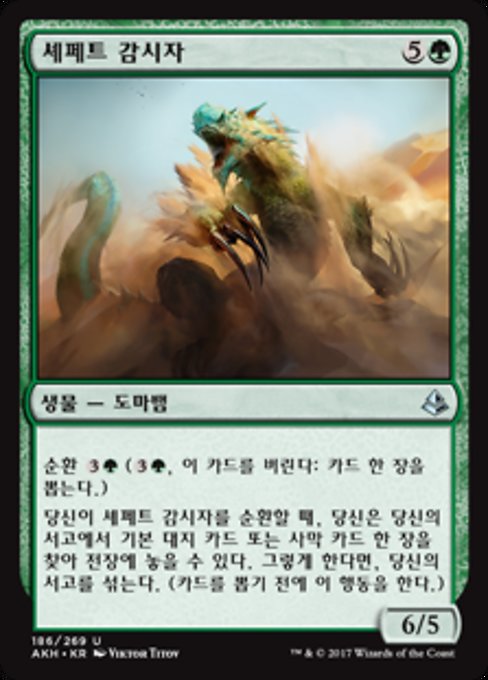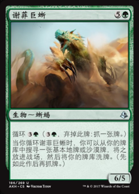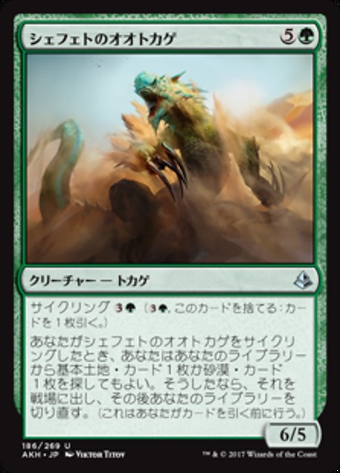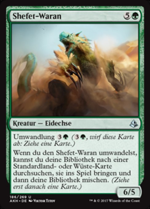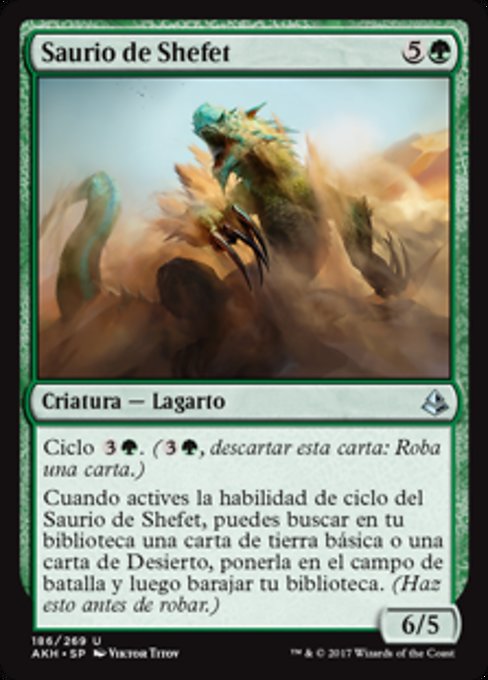 ![]() Variations— Parts— | Shefet Monitor6 / 5 Cycling When you cycle this card, you may search your library for a basic land card or a Desert card, put it onto the battlefield, then shuffle. (Do this before you draw.)