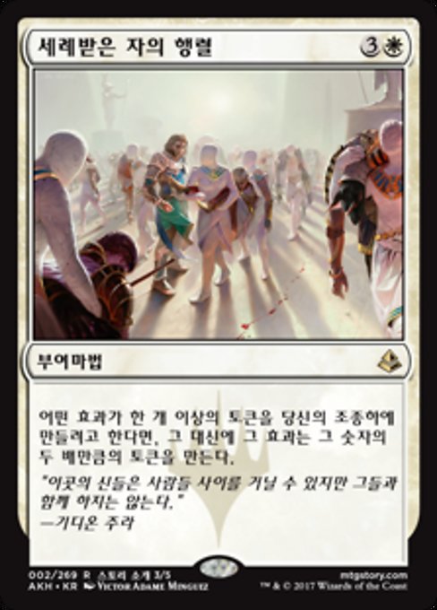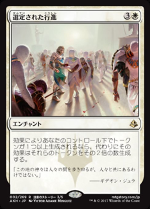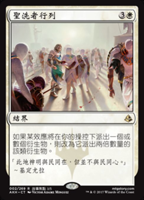 ![]() Variations— Parts— | Anointed ProcessionIf an effect would create one or more tokens under your control, it creates twice that many of those tokens instead.