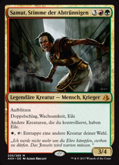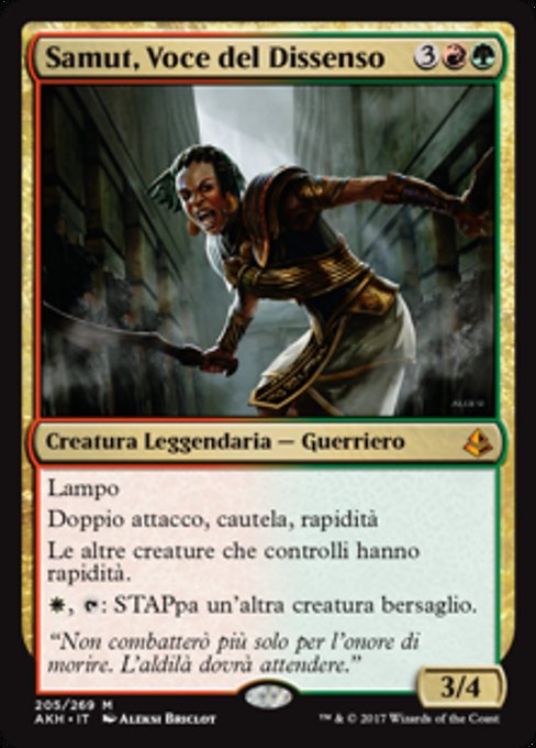 ![]() Variations— Parts— | Samut, Voice of Dissent3 / 4 Flash Double strike, vigilance, haste Other creatures you control have haste.