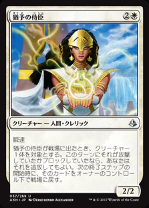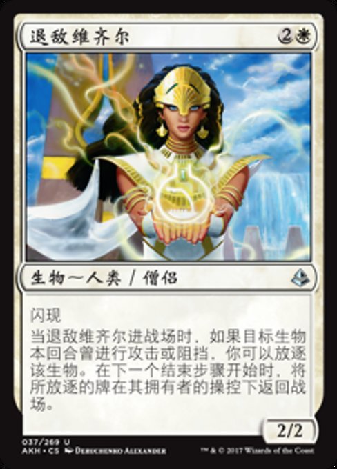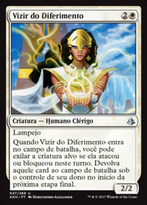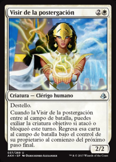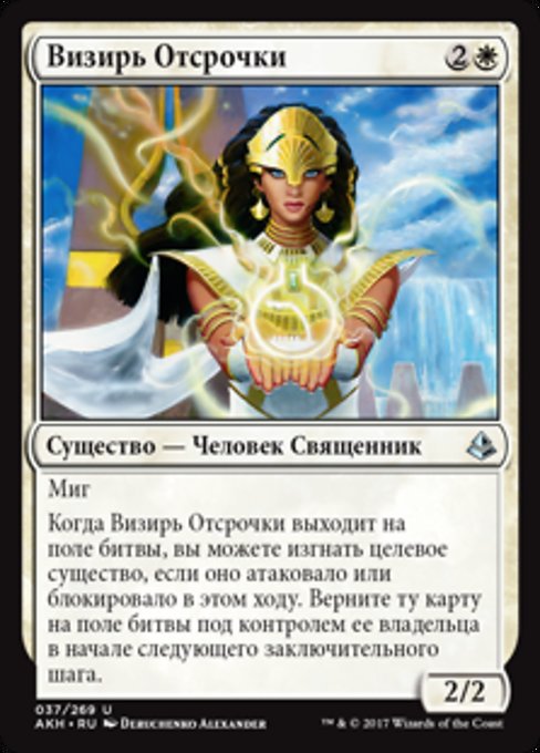 |  Variations— Parts— | Vizier of Deferment2 / 2 Flash When this creature enters, you may exile target creature if it attacked or blocked this turn. Return that card to the battlefield under its owner's control at the beginning of the next end step.