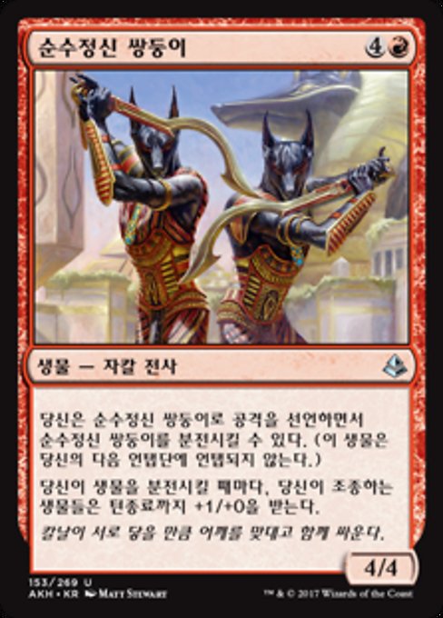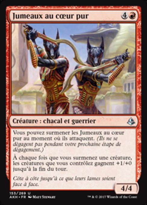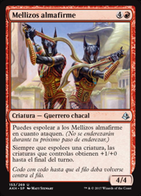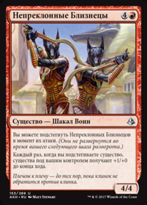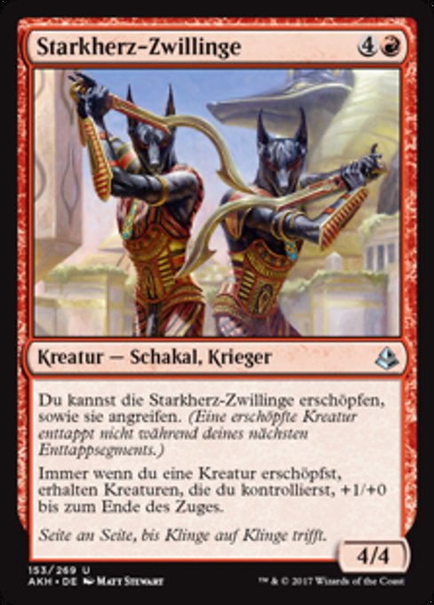 ![]() Variations— Parts— | Gemelli dal Cuore Saldo4 / 4 Puoi stremare i Gemelli dal Cuore Saldo mentre attaccano. (Non STAPperanno durante il tuo prossimo STAP.) Ogniqualvolta stremi una creatura, le creature che controlli prendono +1/+0 fino alla fine del turno.