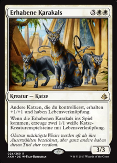 |  Variations— Parts— | Lince Reale3 / 3 Gli altri Felini che controlli prendono +1/+1 e hanno legame vitale. Quando la Lince Reale entra nel campo di battaglia, crea due pedine creatura Felino 1/1 bianche con legame vitale.