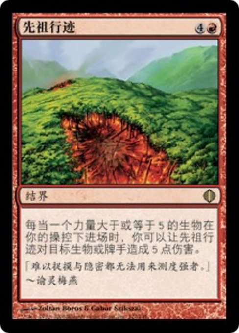 ![]() Variations— Parts— | Dove Camminano Gli AntichiOgniqualvolta una creatura con forza pari o superiore a 5 entra in gioco sotto il tuo controllo, puoi fare infliggere da Dove Camminano Gli Antichi 5 danni a una creatura o a un giocatore bersaglio.