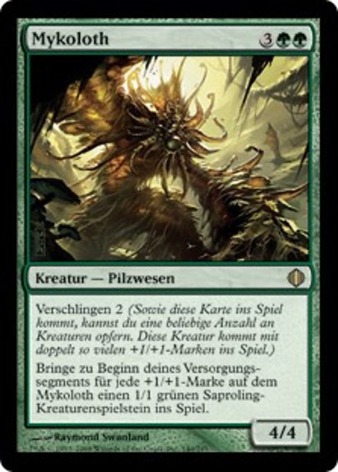 |  Variations— Parts— | Fungoloth4 / 4 Divorare 2 (Mentre questa creatura entra in gioco, puoi sacrificare un qualsiasi numero di creature. Entra in gioco con un numero di segnalini +1/+1 pari al doppio delle creature sacrificate.) All'inizio del tuo mantenimento, metti in gioco una pedina creatura Saprolingio 1/1 verde per ogni segnalino +1/+1 sul Fungoloth.
