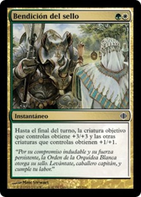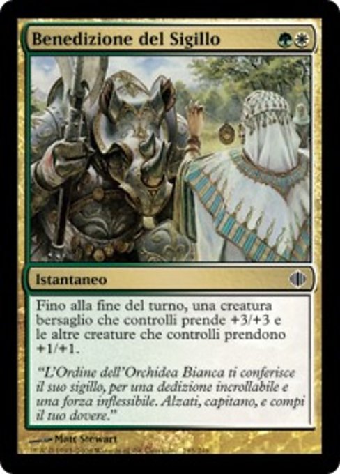 ![]() Variations— Parts— | Benedizione del SigilloFino alla fine del turno, una creatura bersaglio che controlli prende +3/+3 e le altre creature che controlli prendono +1/+1.