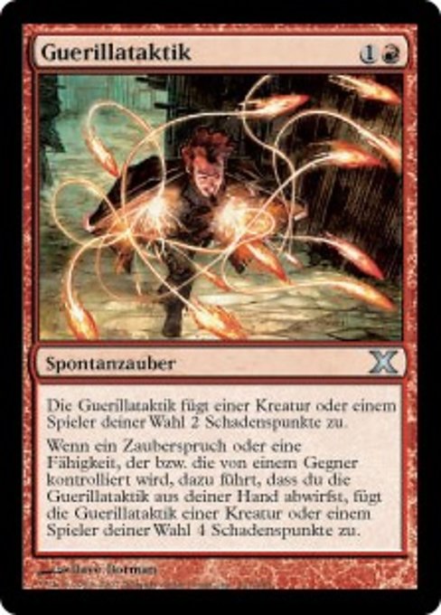 ![]() Variations : 1Parts— | GuerillataktikDie Guerillataktik fügt einer Kreatur oder einem Spieler Deiner Wahl 2 Schadenspunkte zu. Wenn ein Zauberspruch oder ein Effekt eines Gegners Dich dazu zwingt die Guerillataktik von Deiner Hand abzuwerfen, fügt die Guerillataktik einer Kreatur oder einem Spieler Deiner Wahl 4 Schadenspunkte zu.