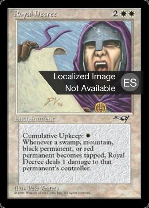 ![]() Variations— Parts— | Royal DecreeCumulative upkeep Whenever a Swamp, Mountain, black permanent, or red permanent becomes tapped, this enchantment deals 1 damage to that permanent's controller.