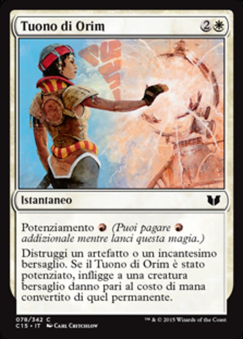 |  Variations— Parts— | Tuono di OrimPotenziamento  Distruggi un artefatto o un incantesimo bersaglio. Se hai pagato il costo di potenziamento, il Tuono di Orim infligge un ammontare di danni pari al costo di mana convertito di quell'artefatto o incantesimo a una creatura bersaglio.