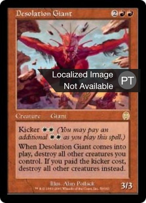 |  Variations— Parts— | Gigante della Desolazione3 / 3 Potenziamento  Quando il Gigante della Desolazione entra in gioco, distruggi tutte le altre creature che controlli. Se hai pagato il costo di potenziamento, distruggi invece tutte le altre creature.