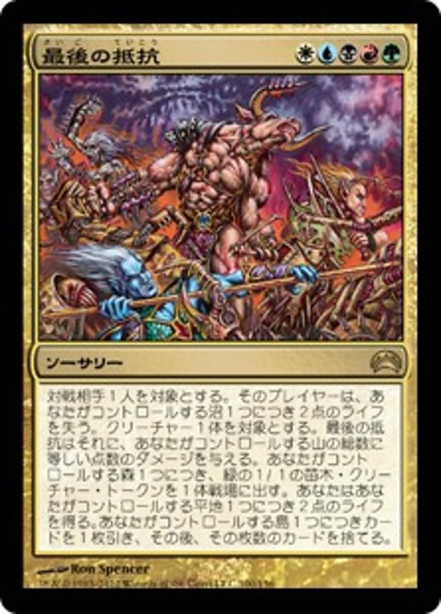 |  Variations— Parts— | 最後の抵抗Target opponent loses 2 life for each Swamp you control. Last Stand deals damage to target creature equal to the number of Mountains you control. Create a 1/1 green Saproling creature token for each Forest you control. You gain 2 life for each Plains you control. Draw a card for each Island you control, then discard that many cards.