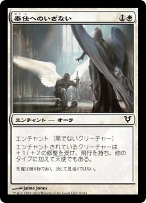 ![]() Variations— Parts— | Call to ServeEnchant nonblack creature Enchanted creature gets +1/+2, has flying, and is an Angel in addition to its other types.