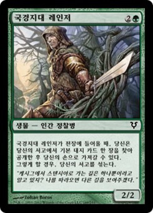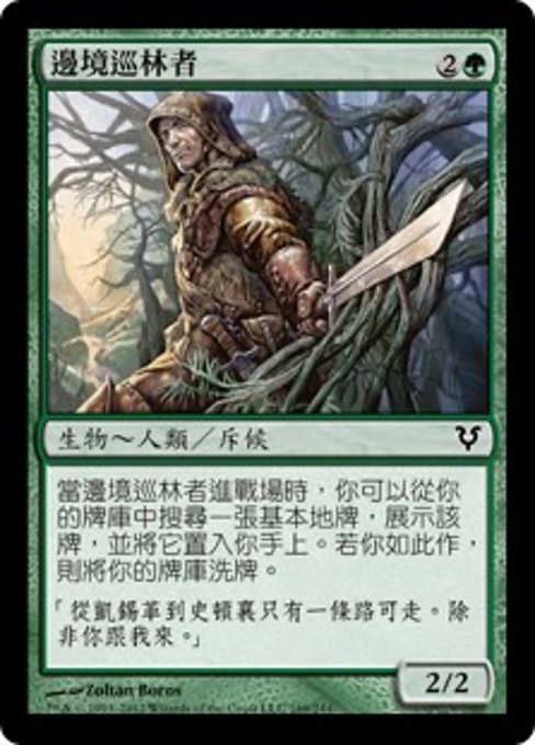 ![]() Variations— Parts— | Ranger delle Terre di Confine2 / 2 Quando il Ranger delle Terre di Confine entra nel campo di battaglia, puoi passare in rassegna il tuo grimorio per una carta terra base, rivelarla e aggiungerla alla tua mano. Se lo fai, rimescola il tuo grimorio.