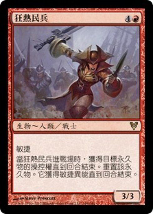 ![]() Variations— Parts— | 狂熱民兵3 / 3 敏捷 當狂熱民兵進戰場時,獲得目標永久物的操控權直到回合結束。 重置該永久物。 它獲得敏捷異能直到回合結束。