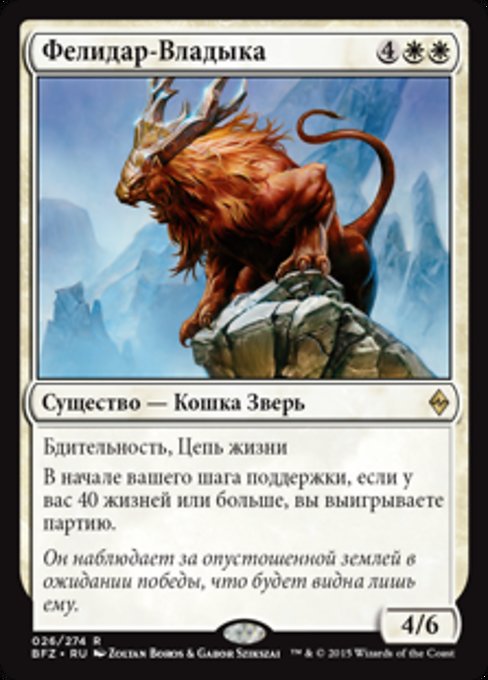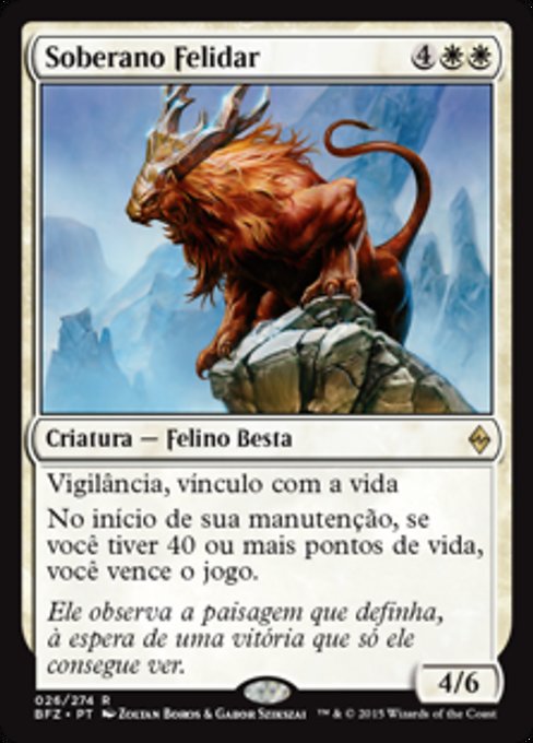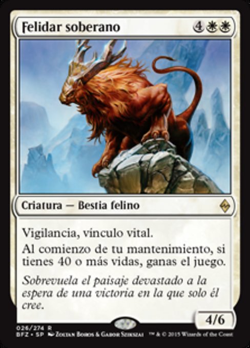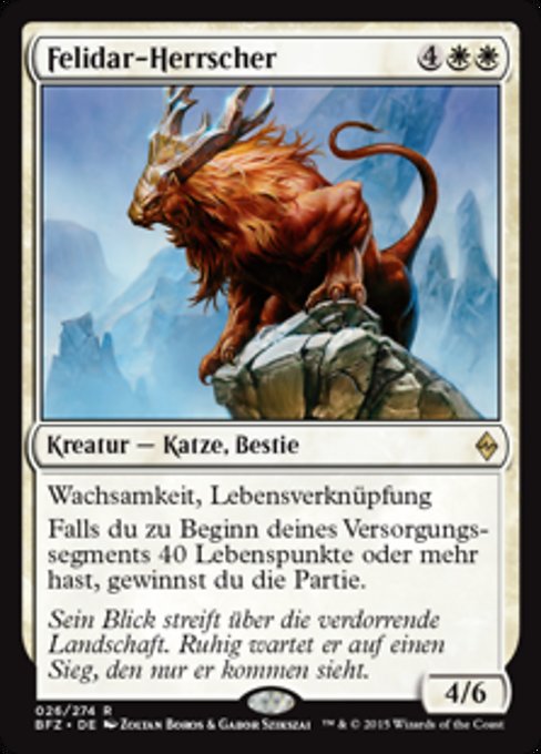 |  Variations— Parts— | Sovrano dei Felidar4 / 6 Cautela, legame vitaleAll'inizio del tuo mantenimento, se hai 40 o più punti vita, vinci la partita.